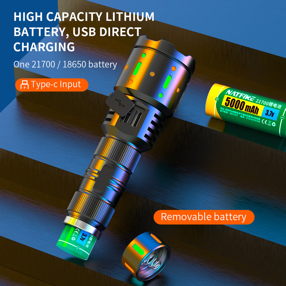 Equipped with compatibility for 26650 and 21700 batteries, the PK14 White Laser Flashlight ensures extended illumination, making it ideal for prolonged outdoor activities. Its long-lasting performance provides peace of mind, knowing that you can rely on this beam emitter even during extended periods without access to power sources.